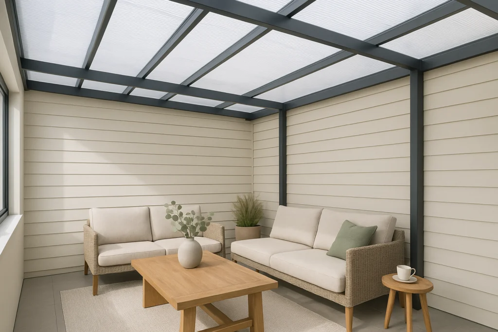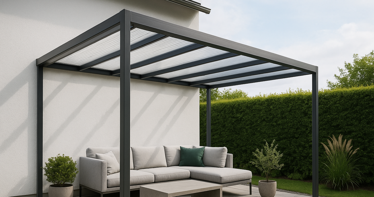 ¿Estás dudando? Te recomendamos policarbonato transparente de 10 mm. ¿Por qué? Es fuerte, resistente a los rayos UV, duradero e ideal para un uso intensivo, perfecto para una pérgola robusta.