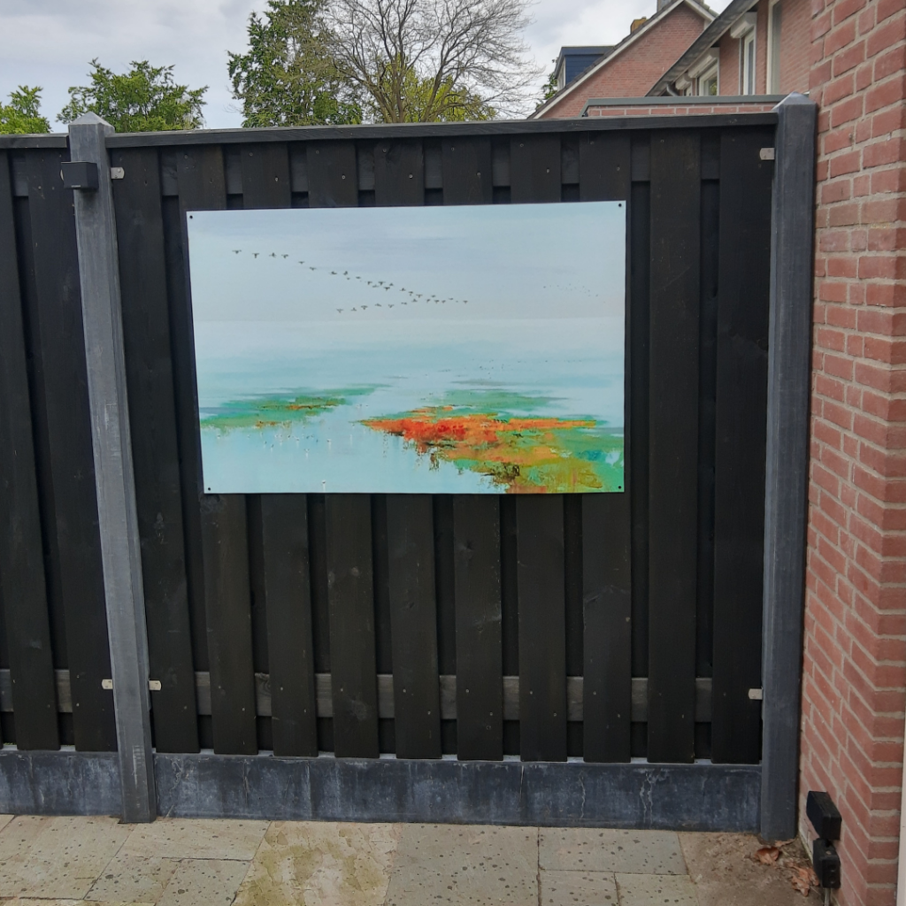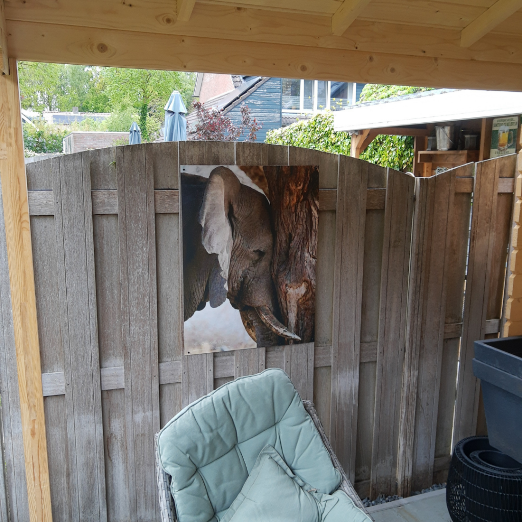 Vincent ha creado y colgado hermosos carteles de jardín sin arandelas, usando metacrilato como firme respaldo.Vincent: “Hemos mandado hacer carteles para el jardín. No queríamos arandelas en los carteles, pero sí un respaldo estable. Dado que la madera requiere de tratamiento, optamos por el metacrilato. El metacrilato y el póster han sido rociados con adhesivo en spray y pegados entre sí. Se perforaron pequeños agujeros para colgar el póster de jardín. Simple pero efectivo.”
