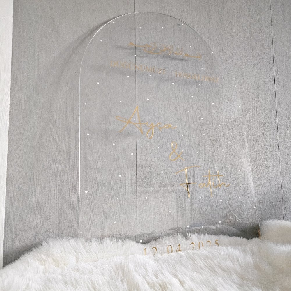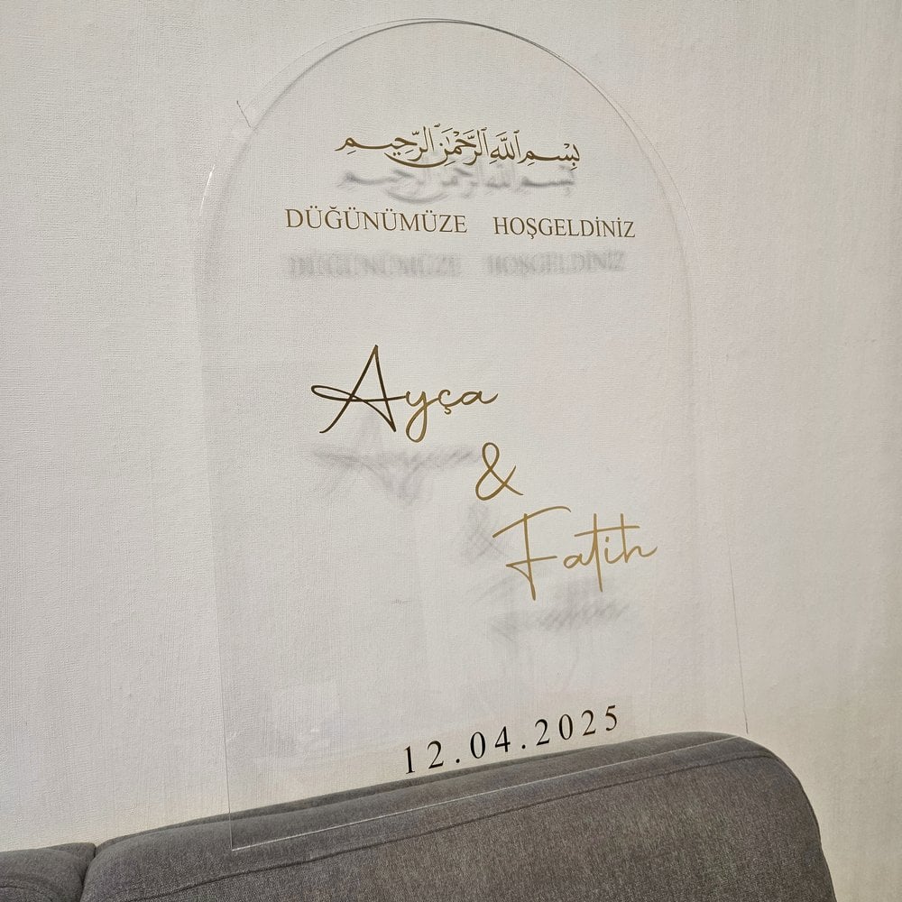Ufuk seleccionó una plancha de metacrilato transparente y curvada en la parte superior como base para un regalo nupcial único. Al colocar letras en la plancha, logró diseñar un regalo personal, único y significativo para la feliz pareja.