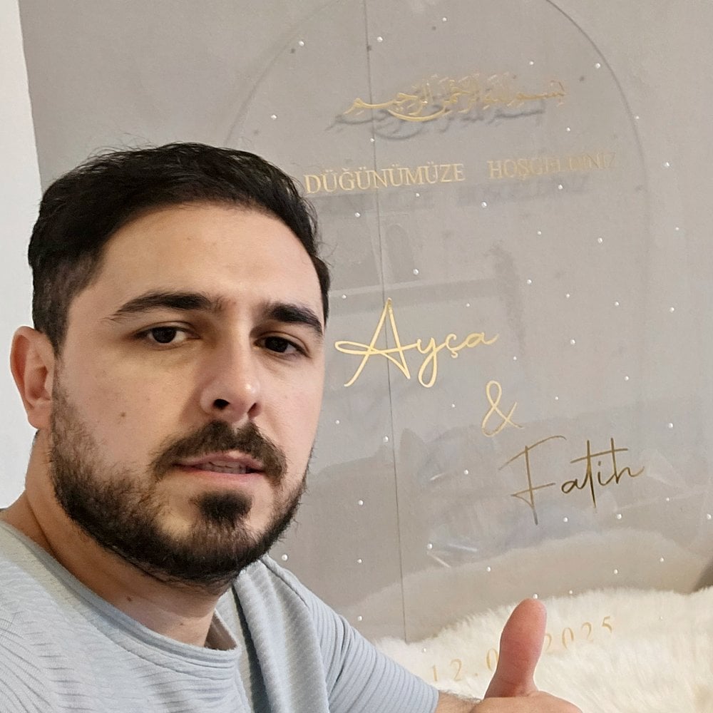 Ufuk creó un precioso regalo personalizado para una boda. Utilizó una plancha transparente de metacrilato con un arco elegante y lo personalizó pegando letras en la plancha. ¿El resultado? ¡Una pareja de recién casados feliz!